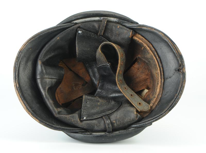 Intérieur de bombe garnie de caoutchouc-mousse, deux bandes de renfort en cretonne de lin enduites disposées en croix, coiffe proprement dite en basane de mouton constituée d'un bandeau de cuir de mouton marron et glacé bordé de six dents de loup avec œillets pour fixation d’un lacet de serrage. Taille «57». Bavolet en mouton chromé et noirci, doublé de cretonne formant jugulaires. À hauteur des oreilles, deux ouvertures circulaires masquées par un déflecteur. Très bon état.